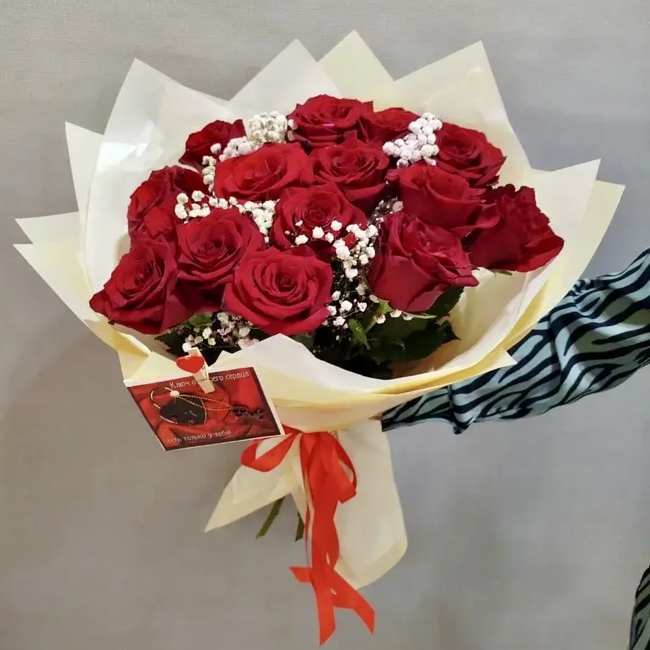 роза-15шт, гипсофила, упаковка, лента |