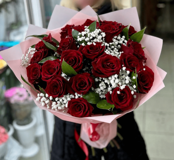роза - 21 шт., гипсофила, зелень, упаковка, лента |
