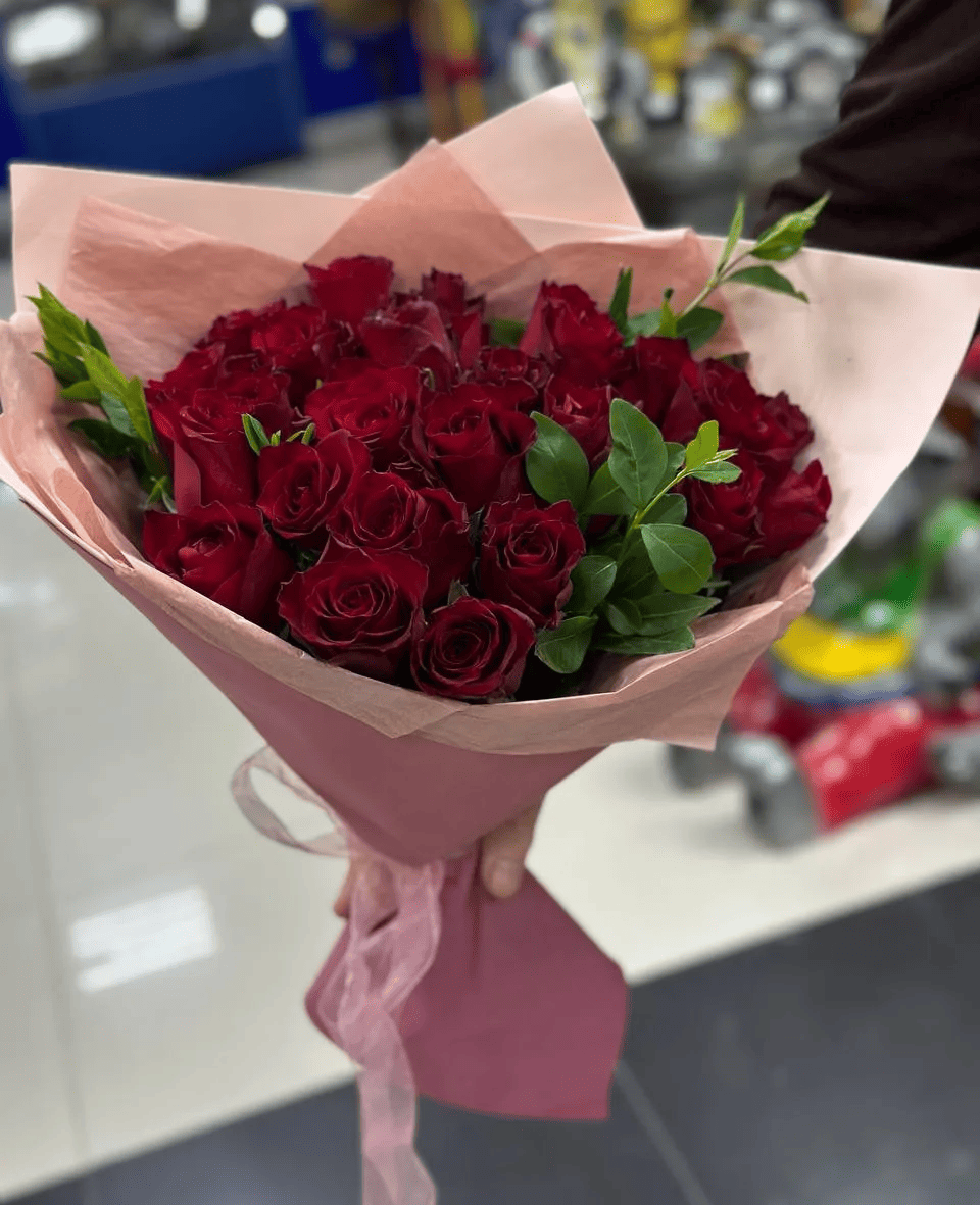 роза-25шт, зелень, упаковка, лента |