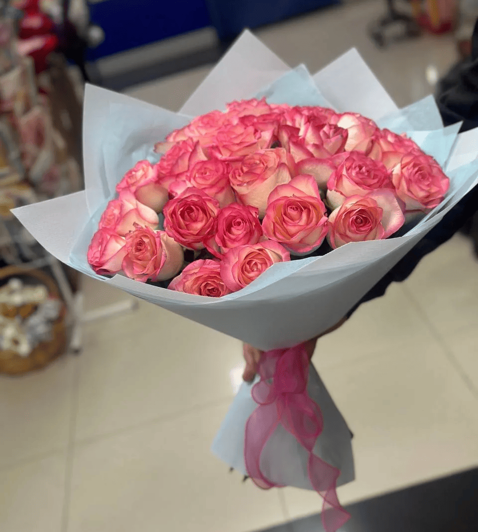 Роскошный букет из 25 роз Джумилия в стильной упаковке - это воплощение нежности, элегантности и утончённого вкуса. Изящные бутоны с белоснежными лепестками и яркой розовой каймой создают неповторимый эффект, делая композицию по-настоящему изысканной и запоминающейся. Розы Джумилия символизируют восхищение, искренние чувства и романтику.