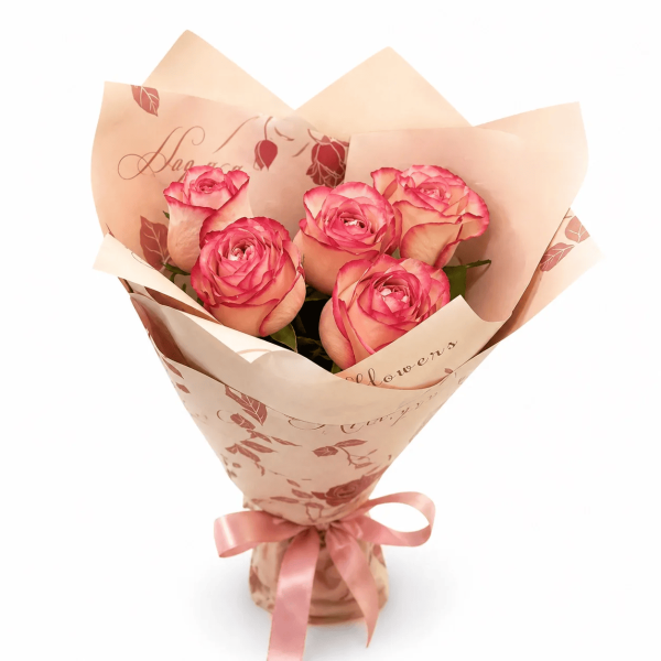 Букет из 5 роз розово-белых оттенков - это утончённая композиция, наполненная лёгкостью, романтикой и мягкими эмоциями. Плавный переход от нежно-розового к белому создаёт воздушный, гармоничный образ, который ассоциируется с искренностью, теплом и заботой.