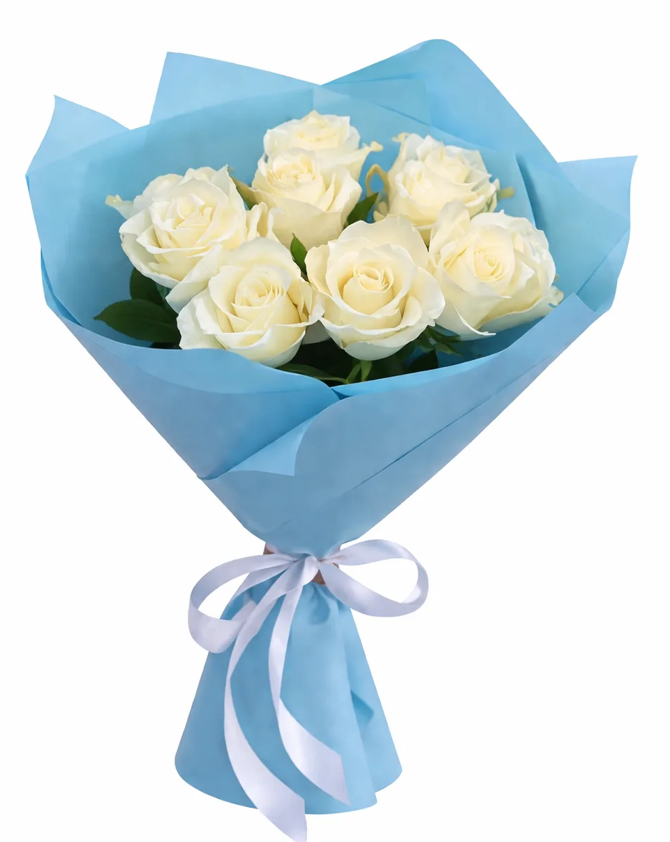 Нежный и изящный букет из 7 белых роз воплощает чистоту, искренность и утончённую красоту. Белоснежные бутоны создают гармоничную и лёгкую композицию, наполненную светом и спокойствием. Голубая упаковка добавляет свежесть и подчёркивает мягкое настроение букета.