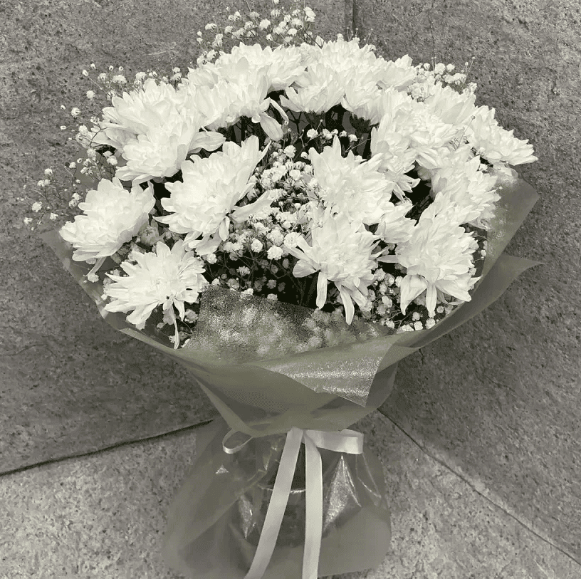 - Делюкс - кустовая хризантема - 15 шт., гипсофила, упаковка, лента