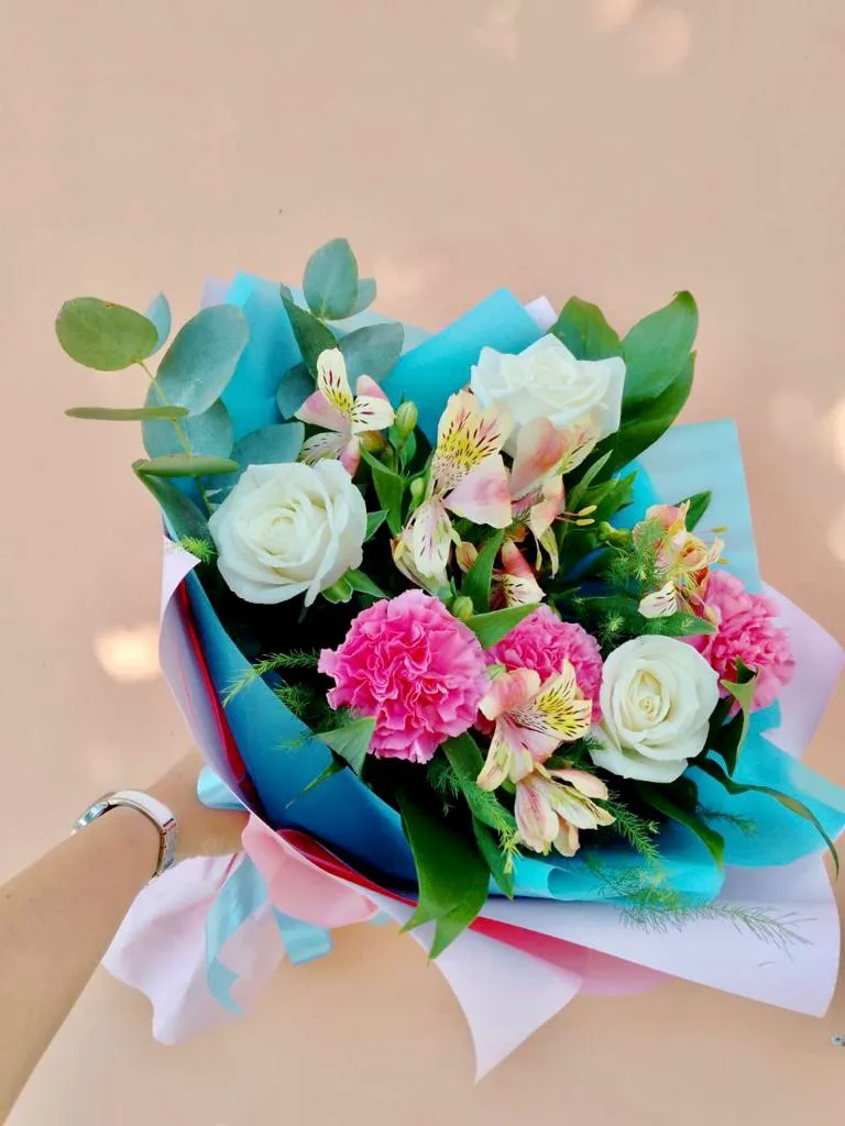 Роза ,гвоздика, альстромерия, эустома, зелень, упаковка, лента |
