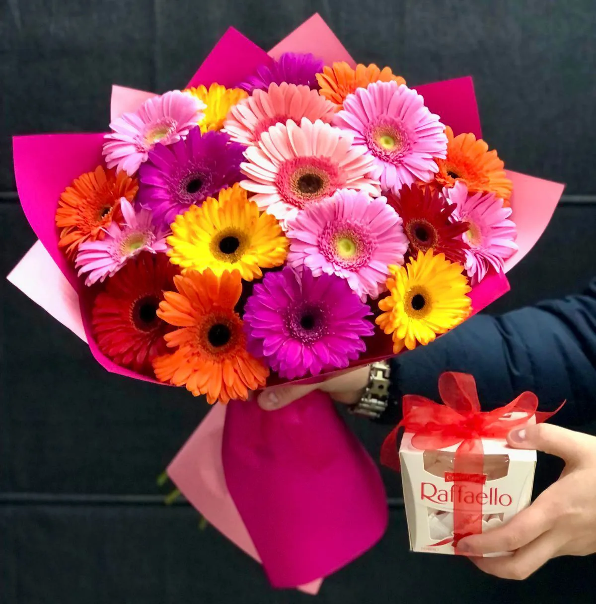 Герберы,упаковка,лента и рафаэлло |