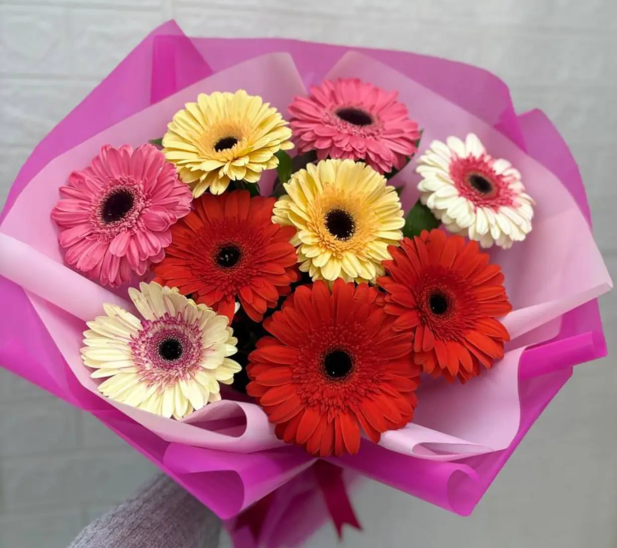 - Средний ( гербера - 9 шт., упаковка, лента + рафаэлло)