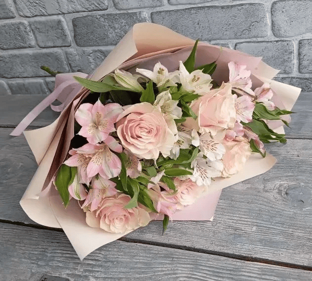 - Средний - роза - 7 шт., альстромерия - 9 шт., зелень, упаковка, лента