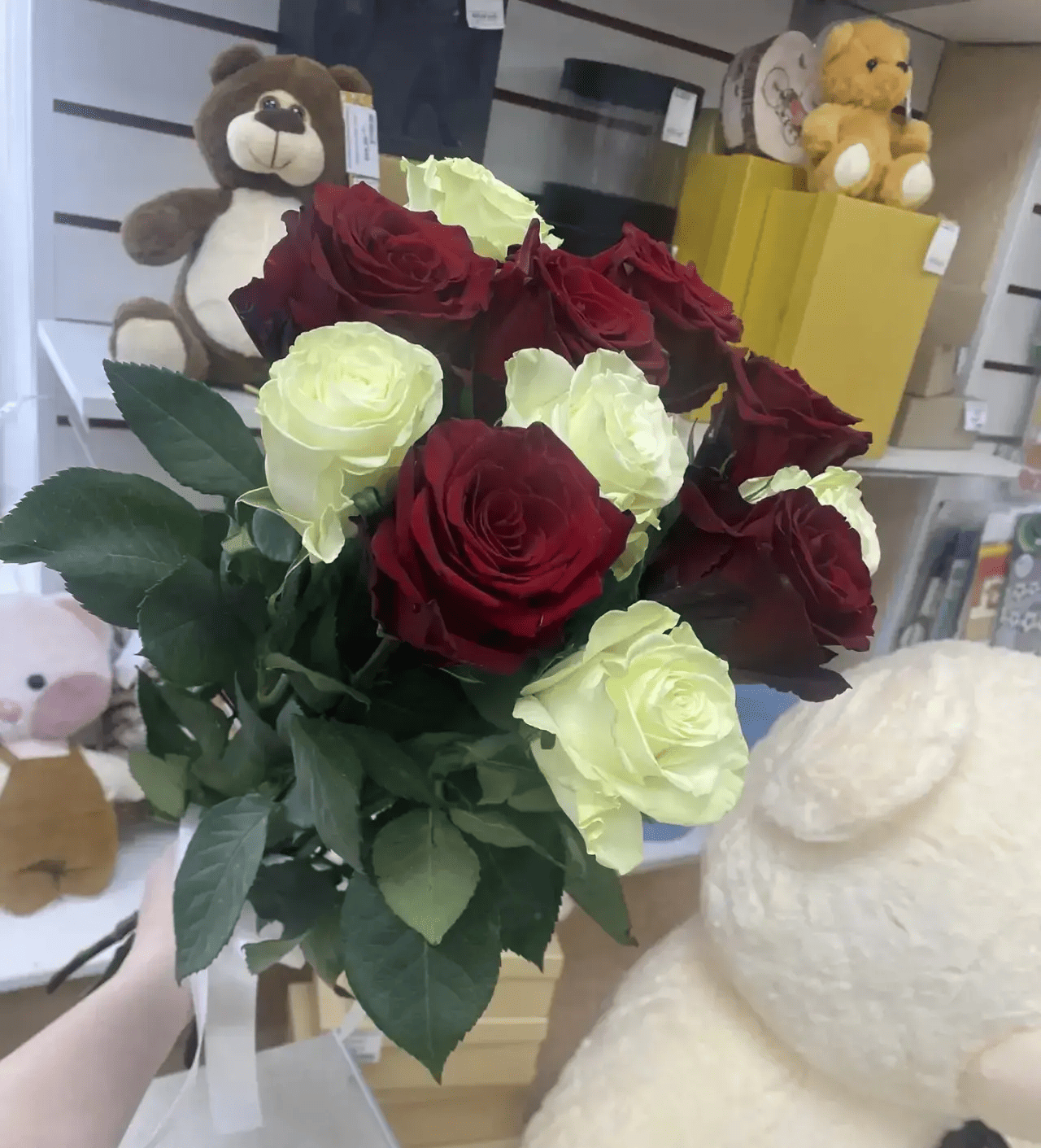 Одноголовые розы - красные и белые,лента |