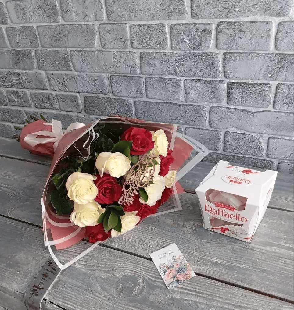 - Премиум - роза - 11 шт., зелень, топпер, упаковка, лента