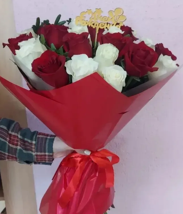 - Делюкс - роза - 25 шт., зелень, топпер, упаковка, лента