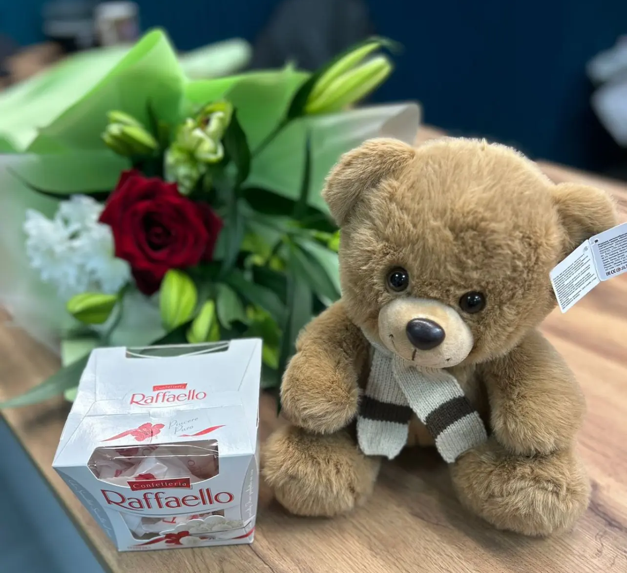 Этот великолепный букет станет настоящим произведением искусства, где каждый цветок играет свою уникальную роль. В центре композиции ярко распустилась красная роза, символизирующая страсть и любовь. Её бархатные лепестки излучают тепло и нежность, привлекая взгляд и вызывая восхищение.