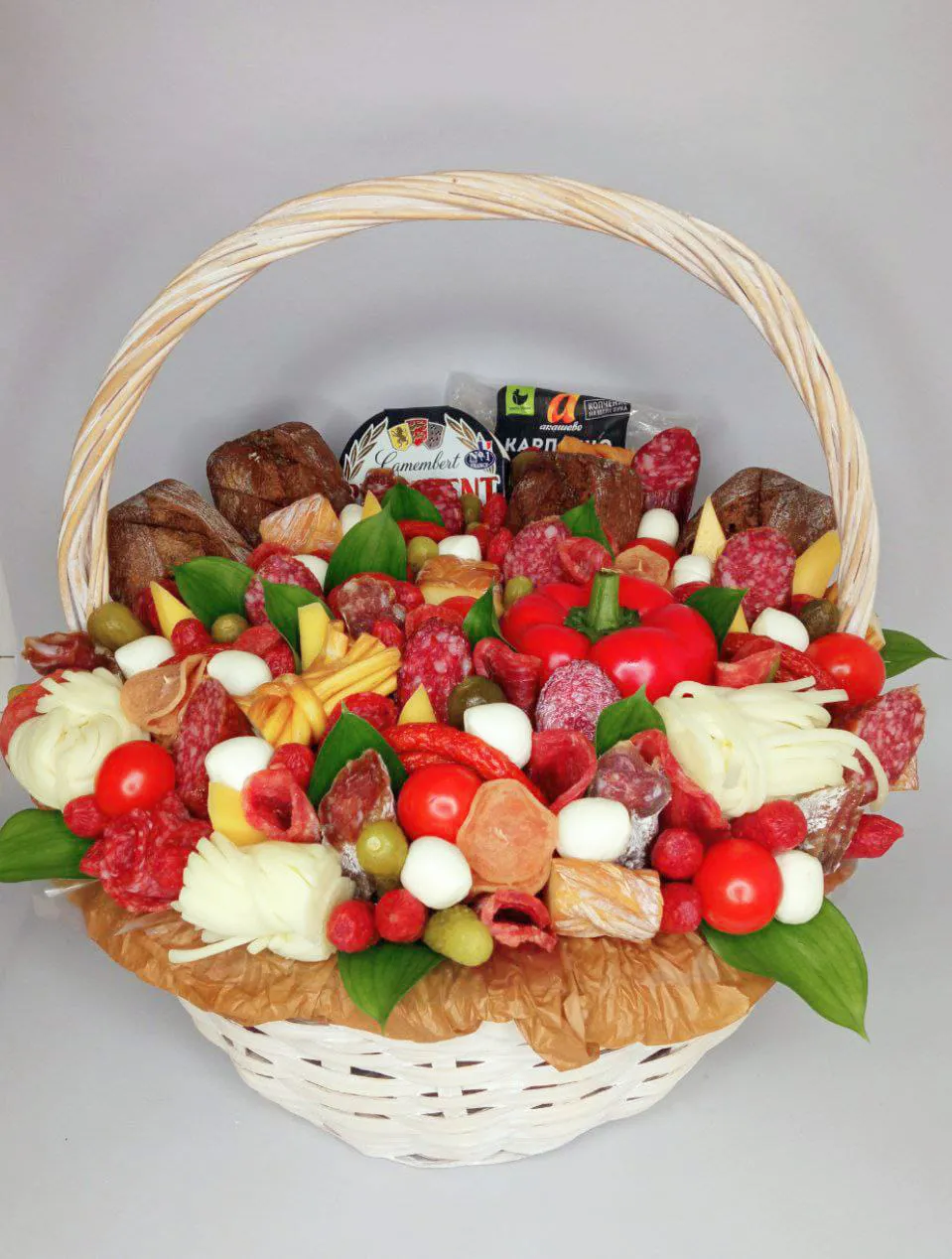 Состав: Сыр, черри, хлеб, перец, колбаса, колбаски ,корзина |