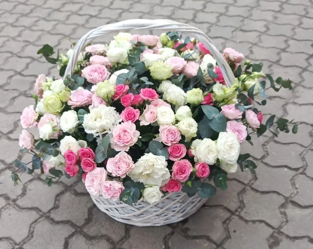 Кустовая роза, пионовидная роза, эустома, эвкалипт, корзина, лента |