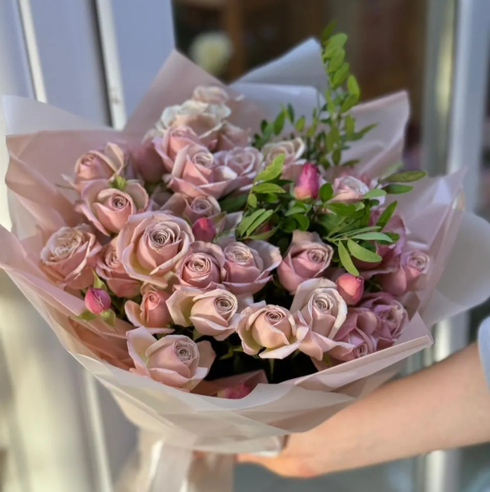 - Средний - кустовая роза - 7 шт., зелень, упаковка, лента