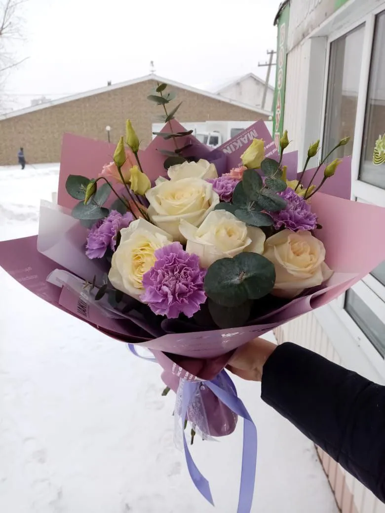 Розы, с их нежными лепестками и царственной аурой, символизируют любовь и страсть. Их пленительный аромат наполняет воздух теплом и чувственностью. Гвоздики добавляют букету текстуру и особую выразительность, их яркие окрасы и изысканная форма делают композицию более динамичной. А эустомы, с их нежными, почти загадочными цветами, привносят в букет нотки утонченности и романтики.