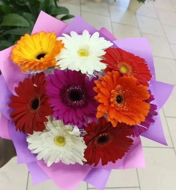 - Премиум - гербера - 9 шт., упаковка, лента