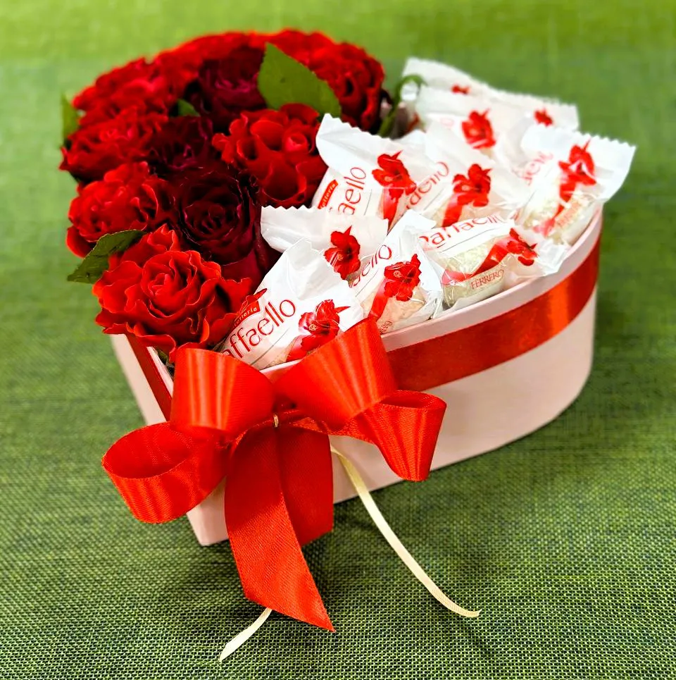 Такой подарок станет идеальным решением для любимой женщины на день рождения, годовщину или просто так, чтобы сказать, как она важна в вашей жизни. Шляпная коробка в виде сердца лишний раз подчеркнет ваши искренние чувства, а в сочетании с цветами и Rafaello создаст незабываемые впечатления.