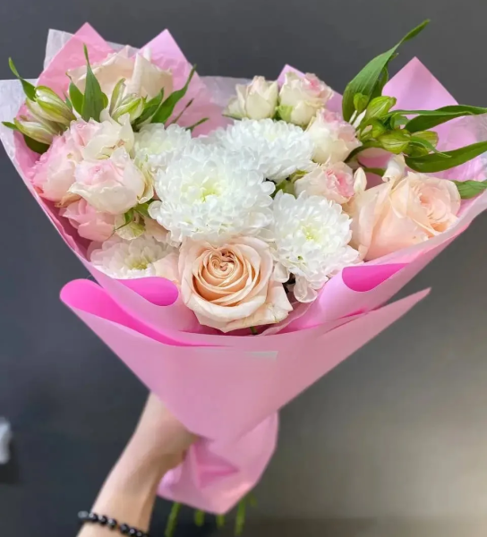 Цветы дополняют друг друга, формируя баланс текстур и оттенков, а стильная упаковка подчёркивает природную красоту букета, делая его идеальным подарком для особого случая или искреннего знака внимания.