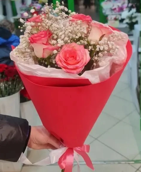 - Мини - роза - 5 шт., гипсофила, упаковка, лента