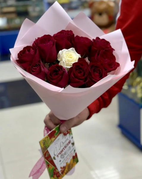 Красные розы олицетворяют любовь, восхищение и глубокие эмоции, а белая роза в центре - искренность, верность и особенность того, кому предназначен букет. Стильная упаковка подчёркивает изысканность композиции, делая её идеальным подарком для признания, романтического жеста или особого случая.
