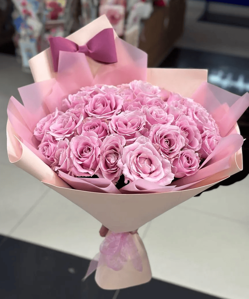 Розовый оттенок роз символизирует благодарность, симпатию и лёгкую романтику, поэтому такой букет станет идеальным подарком для любимого человека, мамы, подруги или коллеги.