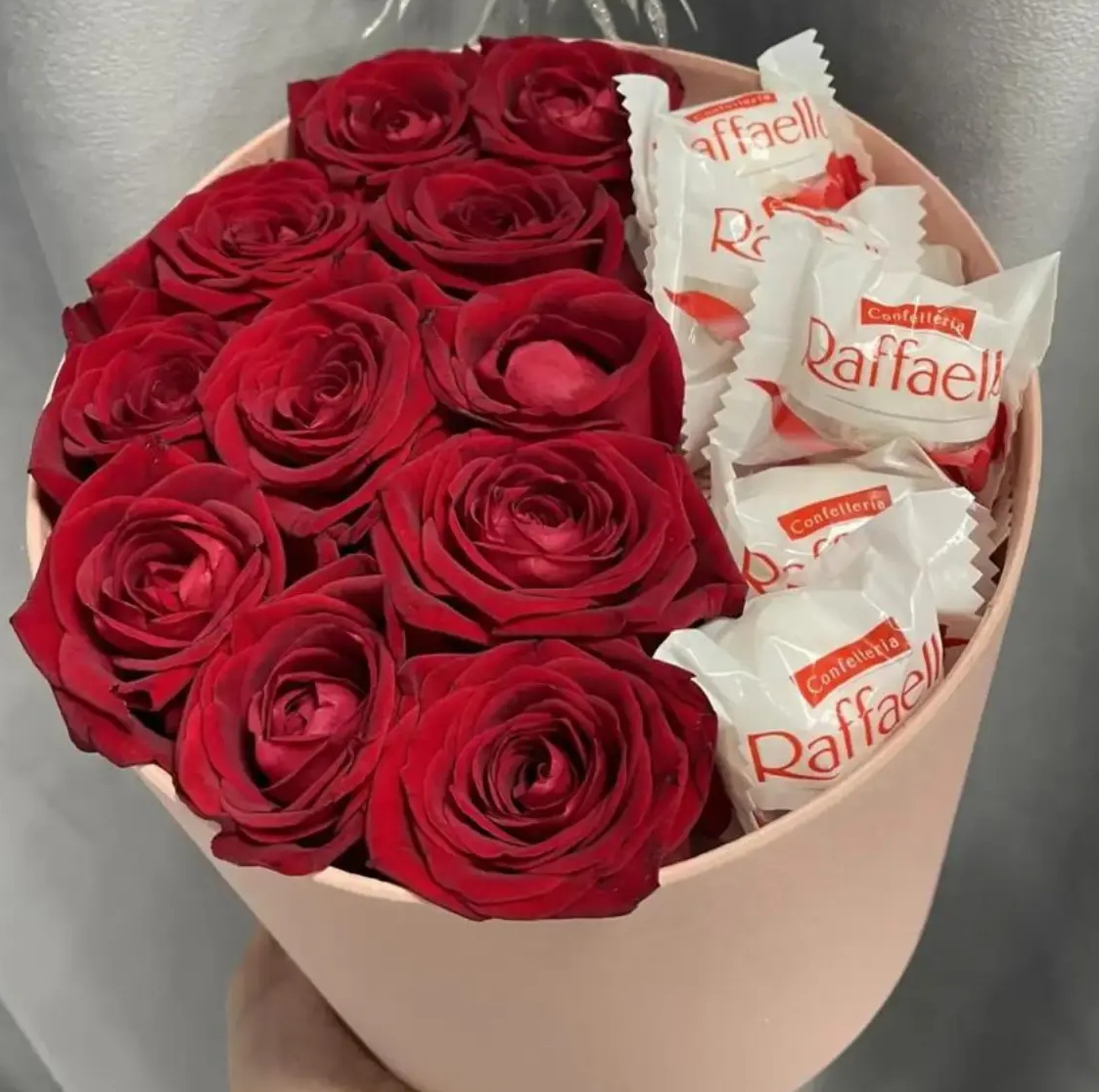 - Состав: роза - 11 шт., оазис, коробка, коробка конфет Raffaello (150 гр.)