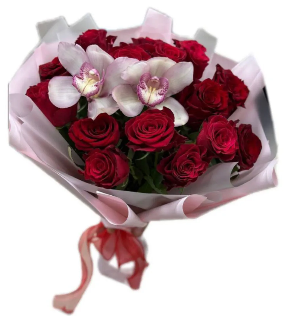 роза-15 шт, орхидея-2 шт, упаковка, лента |