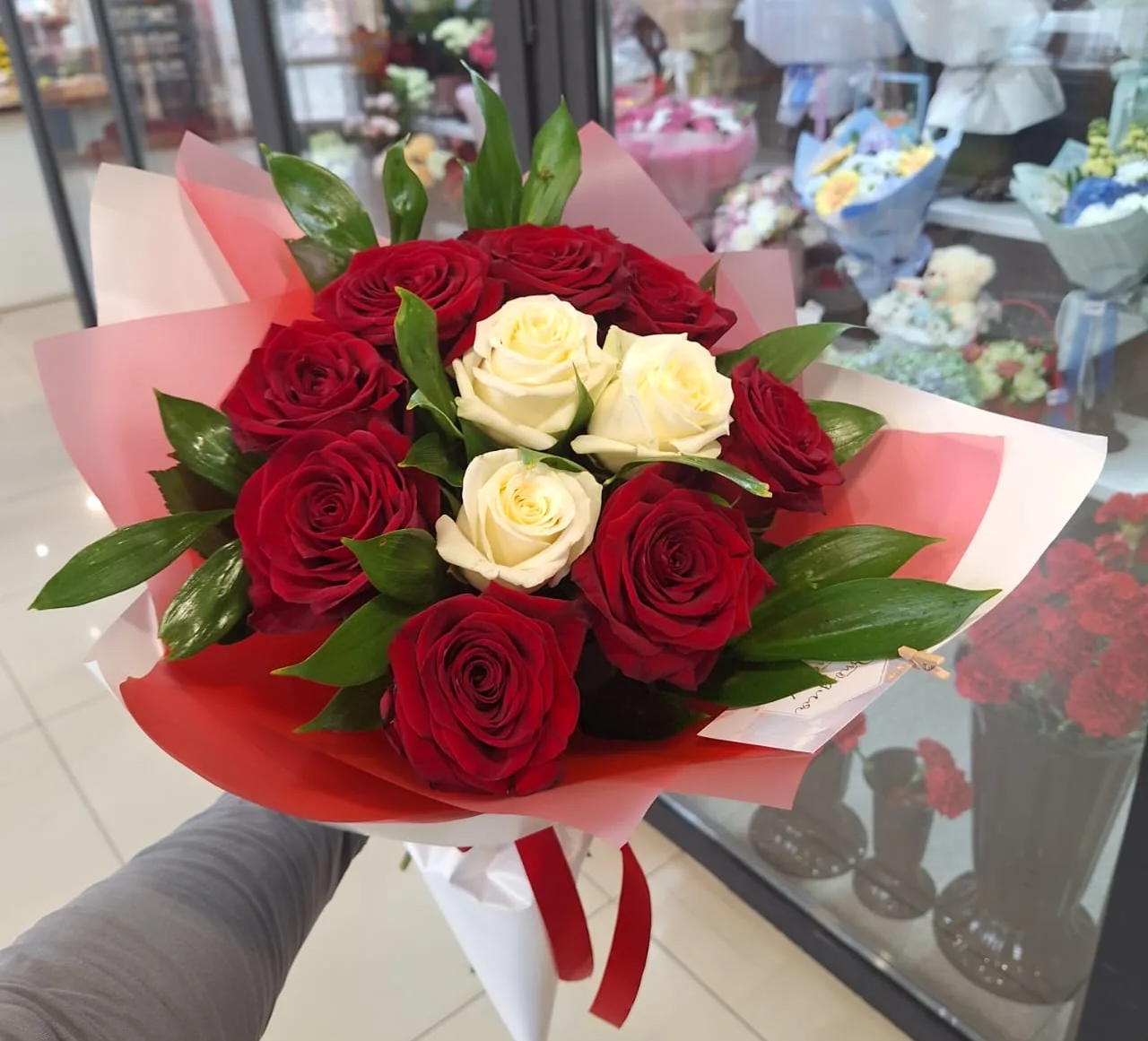 - Средний - роза - 11 шт, зелень, упаковка, лента