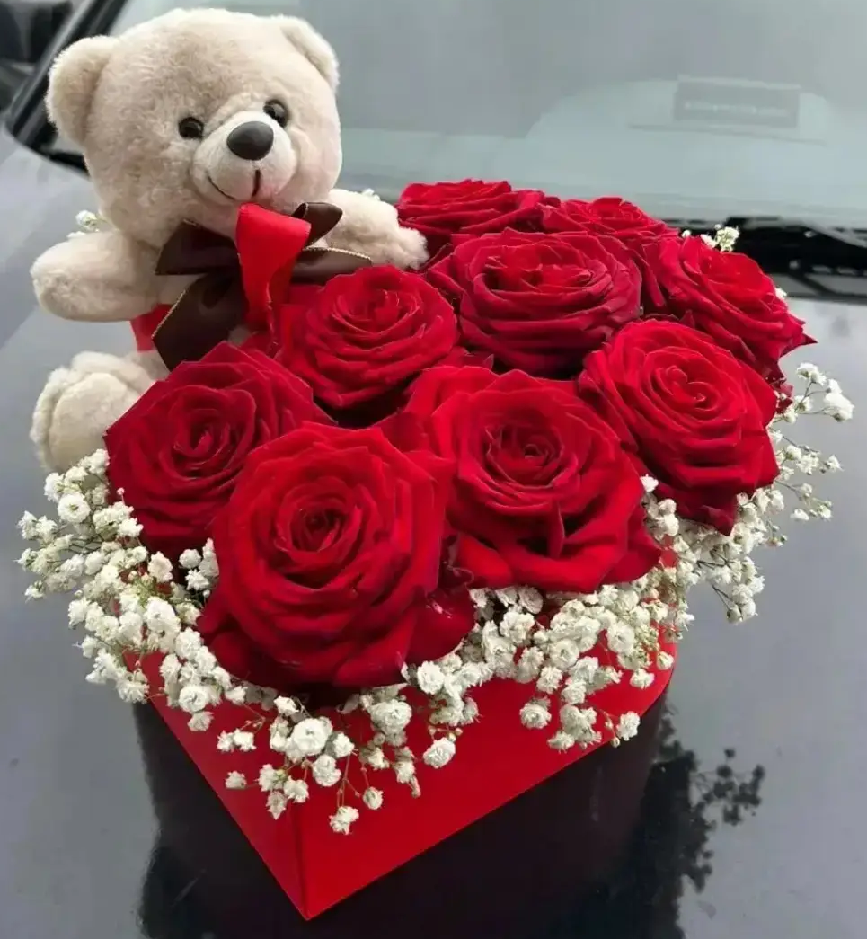 - Стандарт - розы - 9 шт. ,гипсофила, игрушка, топпер, оазис, коробка