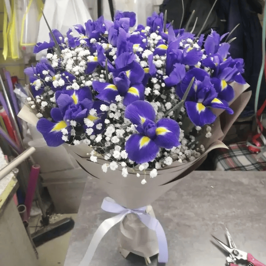 ирис - 15 шт., гипсофила, упаковка, лента |