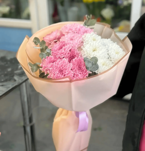 Хризантемы долго сохраняют свежесть, а эвкалипт придаёт букету стильный, современный вид.